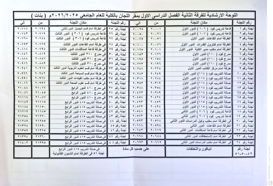 اللوحة الارشادية للفرقة الثانية بنات للفصل الدراسي الاول للعام الجامعى 2026/2025م